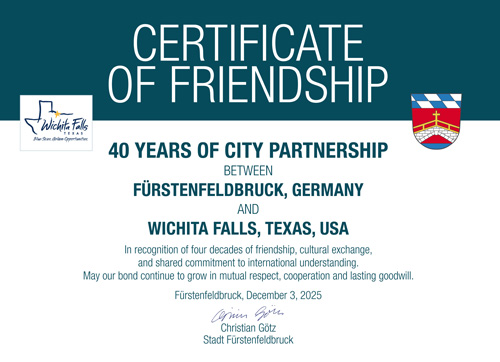 Im Herbst 1983 regte der damalige Bundesminister der Verteidigung Dr. Manfred Wörner daher an, mit der Stadt Wichita Falls die partnerschaftliche Verbindung über den militärischen Bereich hinaus zu vertiefen. Ziel war es, den weiteren Austausch zu fördern. Daraus entstand schließlich im Dezember 1985 die offizielle Städtepartnerschaft. Die Übergabe der Urkunden fand im Sommer 1986 statt. Hierfür reisten der damalige Bürgermeister Max Steer und sein Stellvertreter über den „Großen Teich“. Auch wenn persönliche Begegnungen aufgrund der großen Entfernung über den Atlantik leider kaum möglich sind, ist es der Stadt wichtig, die freundschaftliche Verbindung aufrechtzuerhalten.