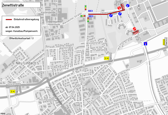 Seit April gibt es Kanalbauarbeiten auf Höhe des Kreisverkehrs Maisacher Straße / Zenettistraße. Seitdem kommt es in diesem ersten Bauabschnitt für vier bis fünf Monate zu geänderten Fahrtwegen und es gilt eine Einbahnstraßenregelung in Fahrtrichtung stadtauswärts.